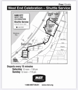 A free shuttle service will be provided by MST to transport attendees to and from the event from various points around Sand City. This service helps alleviate parking concerns and makes it easier for everyone to attend the festival. See map for details.